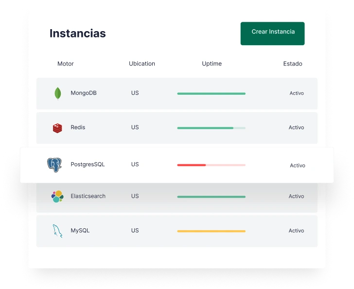 Soportamos los motores de bases de datos más populares del mercado. Elige el que mejor se adapte a tu aplicación y nosotros nos encargamos del resto. Puedes elegir entre MySQL, PostgreSQL, MariaDB, MongoDB, Redis, Elasticsearch y más.