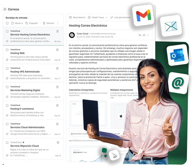 Conecta tu correo corporativo con Gmail, Outlook o cualquier cliente compatible vía SMTP/IMAP. Administra tus mensajes desde la plataforma que ya conoces y mantén la productividad de tu equipo sin complicaciones. Nuestra integración garantiza sincronización rápida y confiable, para que todos tus correos estén disponibles en un solo lugar.